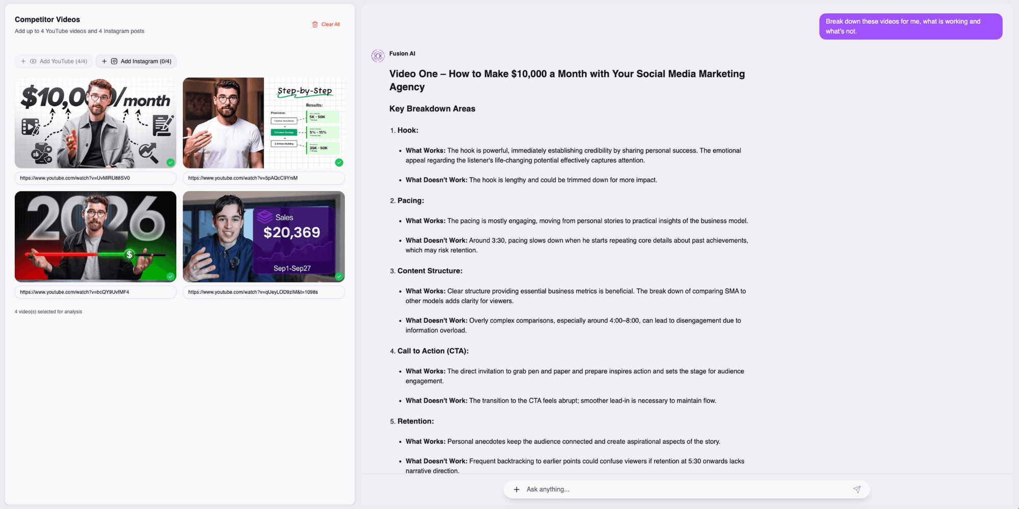Drop in your clients’ top competitors and instantly reveal their top-performing hooks, scripts, and strategies